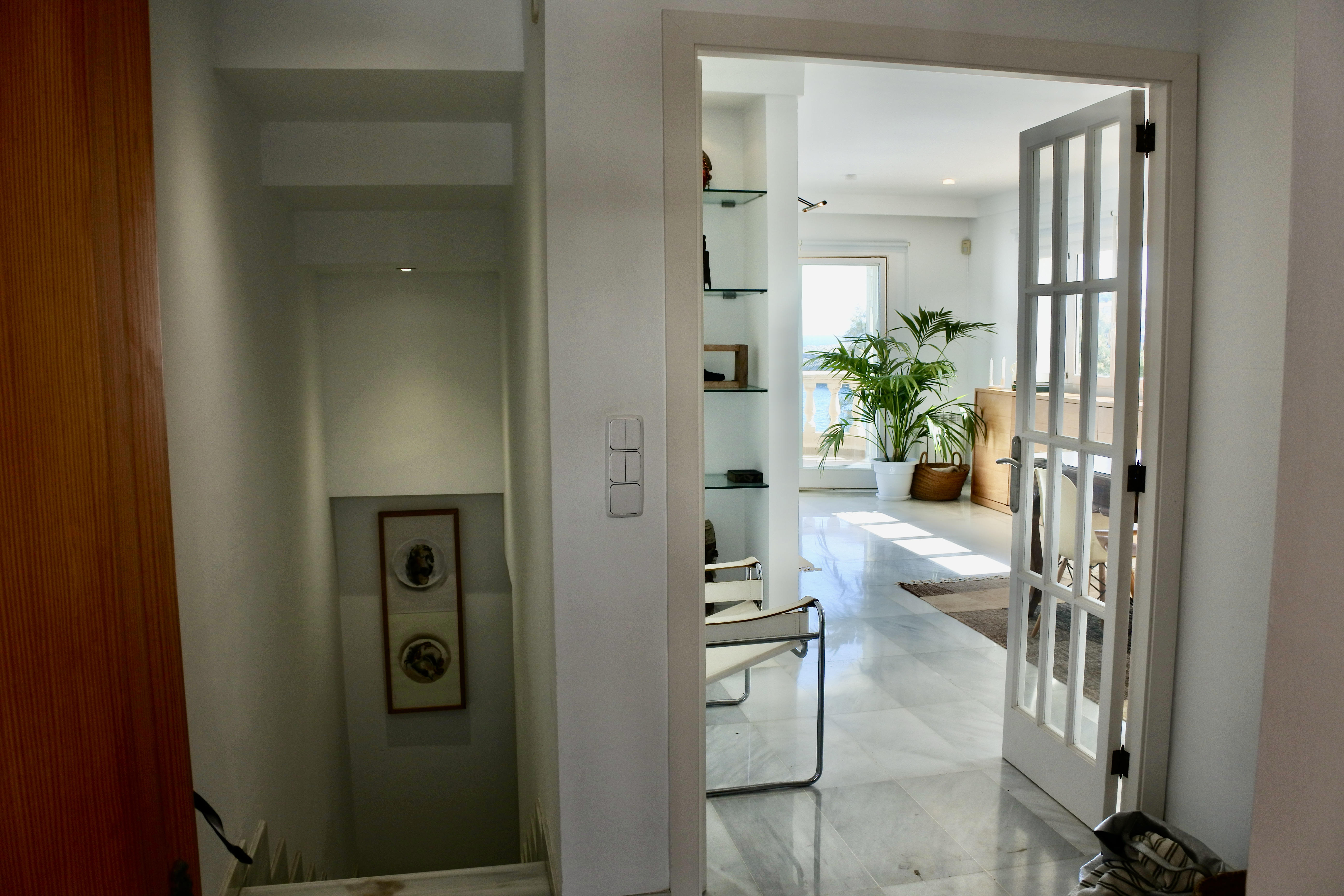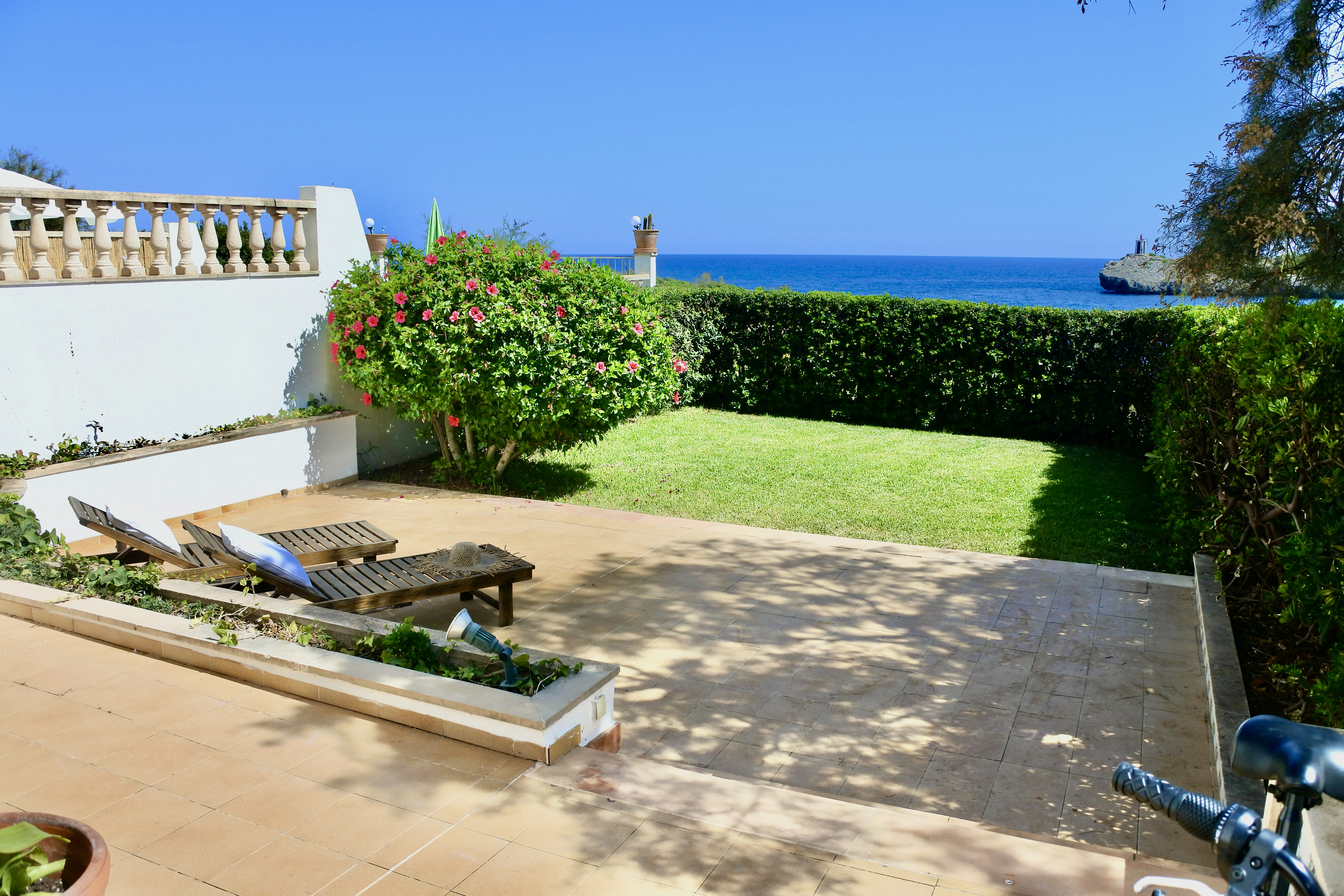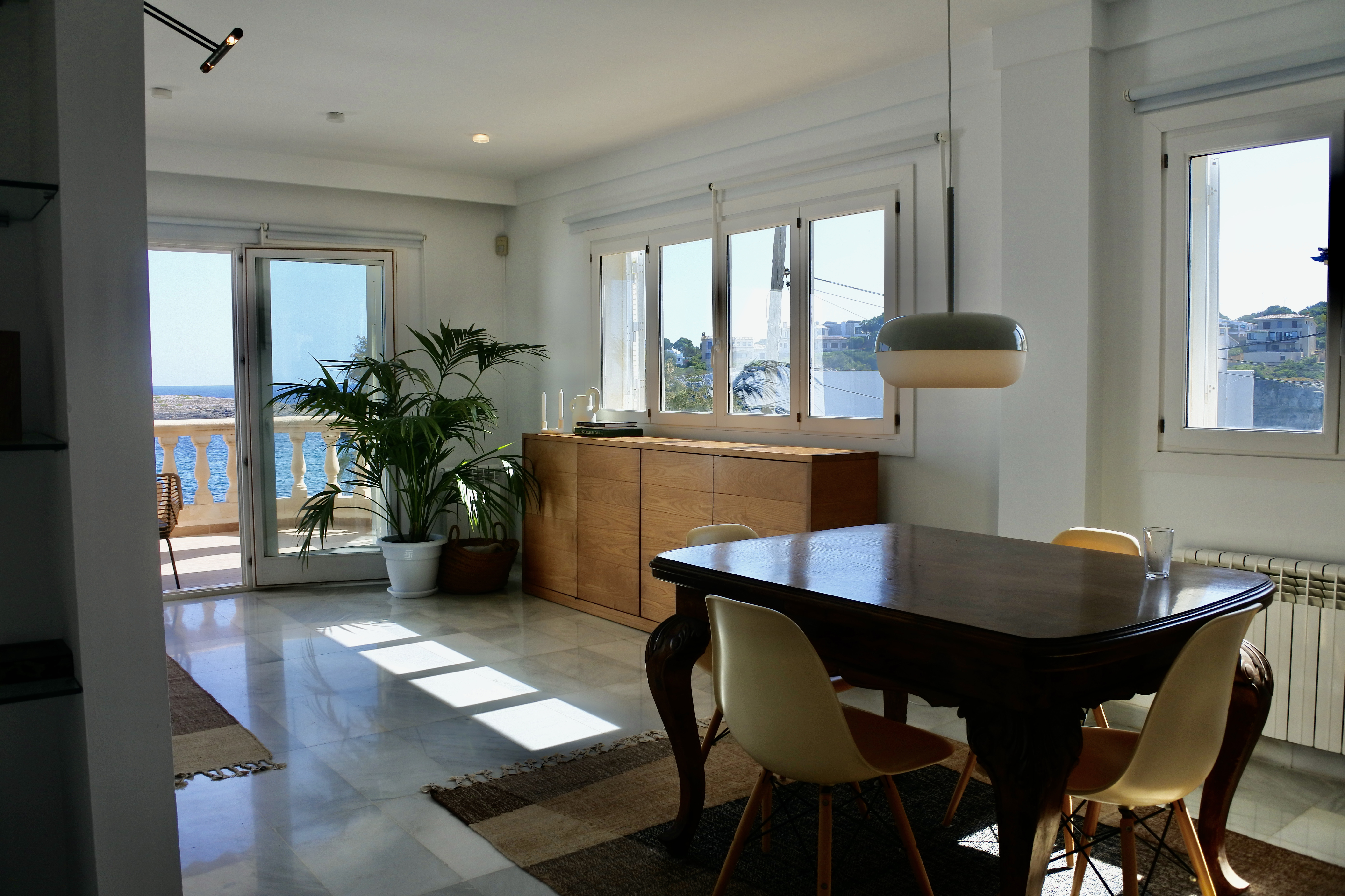 Discover a Mediterranean dream house in the first sea line in one of Porto Cristo’s best locations! The stunning views of the deep blue sea, the charming port entrance, and the famous Porto Cristo lighthouse can be seen from every floor of this upscale two-story duplex residence. This property is a true gem for anyone who enjoys boats, the port, and the nautical lifestyle. You will be astounded by the apartment’s light-filled room layout as soon as you walk in. With its floor-to-ceiling windows, the large living area provides an amazing panoramic view and is the perfect spot to relax. While the completely furnished kitchen with name-brand appliances and a useful storage area will fulfill your culinary fantasies, the neighboring balcony encourages you to enjoy Mediterranean life. While cooking here, you can look out over the glittering water. The tiny but lovely garden, which provides you with a quiet outdoor haven, is a particular feature. The beautiful summer evenings can be spent here relaxing in quiet or mingling with your friends and guests. A pool might be constructed here as well. The 5 rooms are placed in the basement, which is accessed via a graceful staircase. Every morning is made more special by the stunning sea view from the main bedroom. Two more light-filled bedrooms provide a variety of uses; they can be used as an office, guest room, or children’s room. This property is just at a unique location in Porto Cristo’s first sea line.This charming harbor town, renowned for its serene ambiance, stunning beaches, and pristine sea, offers you a taste of Mediterranean charm. Additional amenities include a side entry to the home, a well-kept garden, a covered chill-out space, a wraparound patio, a balcony, and oil heating. This duplex apartment is the ideal fusion of a Mediterranean lifestyle and opulent living. Make this ideal property your new home without delay.